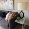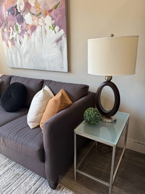 Dark brown wood and chrome lamp with cream coloured oval drum lampshade. Two available. Lamp – 30″H Shade-16″W x 11″Dx11″H