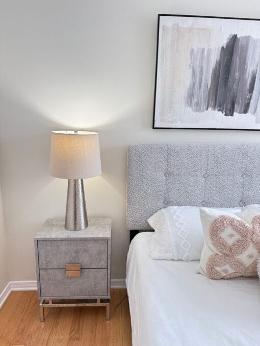 This side/end table provides a contemporary glamorous look to a room. Grey finish that mimics concrete with silver metal drawer pulls and a chrome metal base. Perfect as a nightstand or next to a sofa or chair as a side/end table. Two available. 16″Wx13″Dx24″H