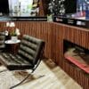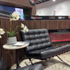 Black leather Barcelona chair. Chrome legs. Two available. 31″Wx30″Dx32″H