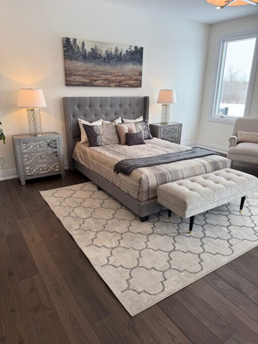 Pale grey velvet-touch trellis patterned area rug. Approximately 8’x10′. (94″x120″)