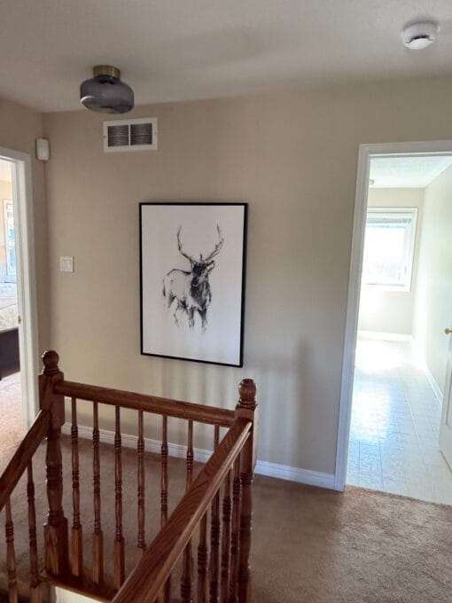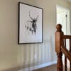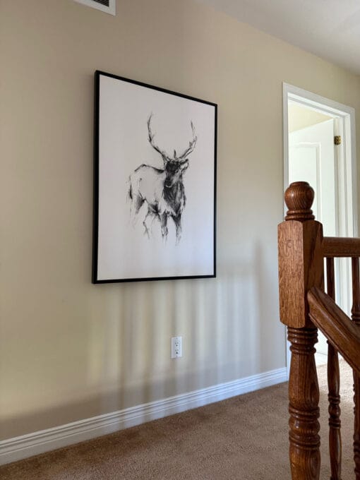 Canvas of deer drawing. See also Moose Canvas for a companion piece to make an even more impressive presentation. Black frame. 28″Wx40″H