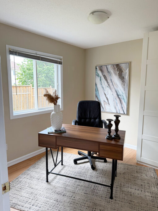 A sleek woodgrain desk with black metal legs and three drawers for storage. Its modern, versatile design makes it perfect for staging offices, work nooks, or contemporary living spaces. Doubles beautifully as an accent table or console. 2 available. 48″Wx24″Dx30″H
