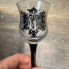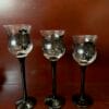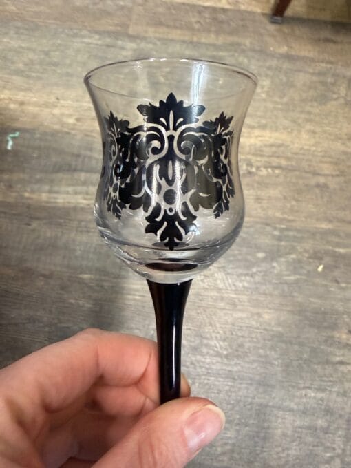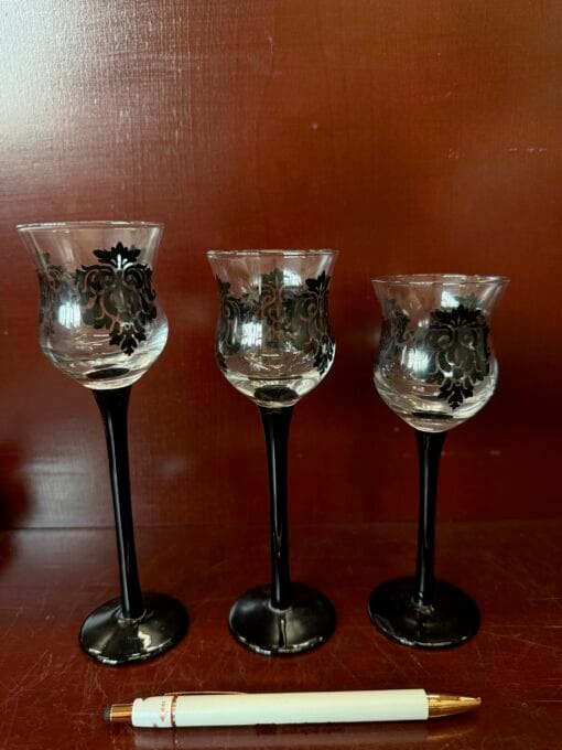 Partylite’s Forbidden Trio Votive candle holders. Clear with black damask decals and slender black arms. approximately 7.5″, 7″ and 6.5″ tall. condition – used – like new