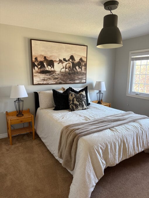 A large format canvas of running horses pushes great energy into any room. A neutral palette is used. 60″Wx40″H