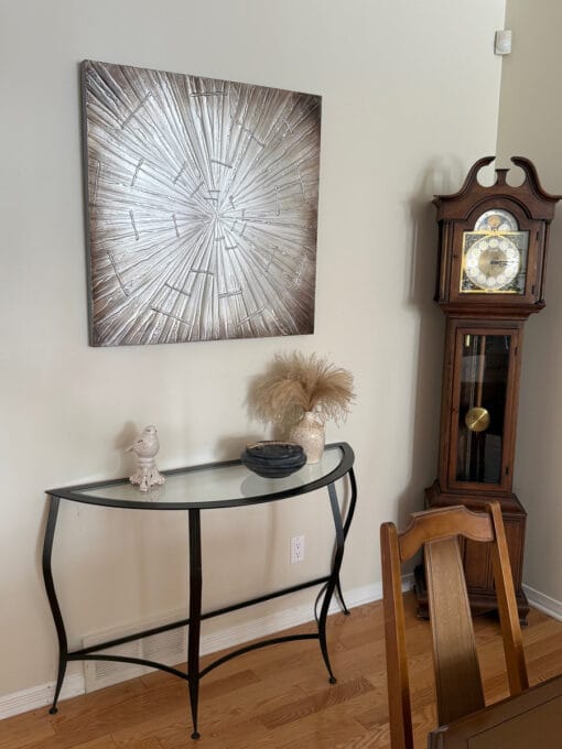 A big starburst of gold and silver metallic colours. Added texture on the canvas brings this piece to life. 34″Wx34″H