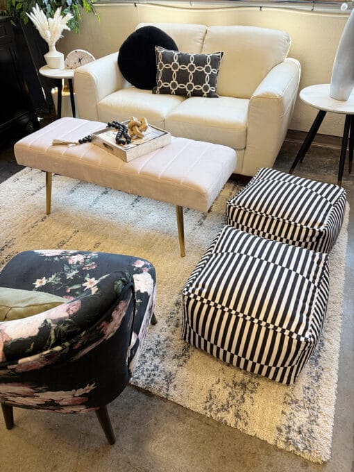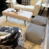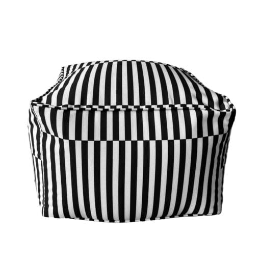 set of 2 black and white striped poufs made with durable, water-, stain-, and fade-resistant fabric. Adds contrast, texture, and modern style to any room. Approximately 18″ x 18″ x 12″H